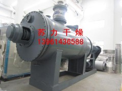 被干燥物料從殼體上方正中間加入,在不斷正反轉(zhuǎn)動(dòng)的耙齒的攪拌下,物料軸向來回走動(dòng),與殼體內(nèi)壁接觸的表面不斷更新,受到蒸汽的間接加熱,耙齒的均勻攪拌,粉碎棒的粉碎,使物料表面水分更有利的排出,氣化的水分經(jīng)干式除塵器、濕式除塵器、冷凝器,從真空泵出口處放空。