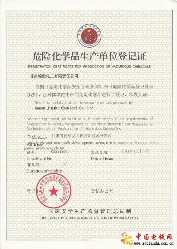 榮譽(yù)資質(zhì) 危險(xiǎn)化學(xué)品生產(chǎn)單位登記證