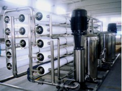 自來(lái)水→多介質(zhì)過(guò)濾器→活性炭過(guò)濾器→軟化水器→中間水箱→低壓泵→精密過(guò)濾器→一級(jí)反滲透→PH調(diào)節(jié)→混合器→二級(jí)反滲透(反滲透膜表面帶正電荷)→純水箱→純水泵→微孔過(guò)濾器→用水點(diǎn)